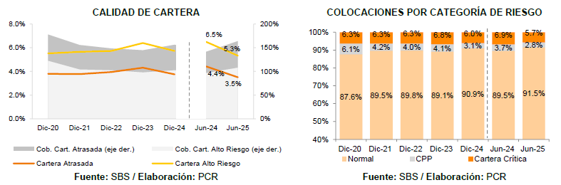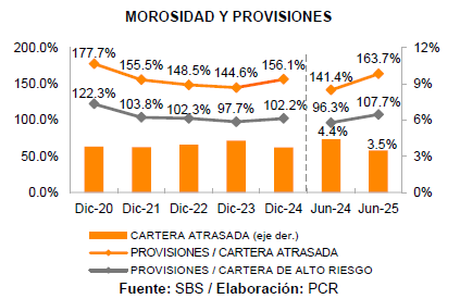 Adecuada cobertura de cartera en riesgo: A junio de 2025, la cobertura de provisiones sobre créditos atrasados tuvo un registro de 163.7% (jun-2024: 141.4%), esto debido a la reducción de la morosidad en la banca respecto al año previo, dado el crecimiento de la actividad local y ausencia de eventos climatológicos de gran magnitud; contrastado por el menor stock de provisiones interanual.  Por su lado, la cobertura de provisiones sobre cartera deteriorada o cartera de alto riesgo (CAR) tuvo un comportamiento similar, dando un registro de 107.7% (jun-2024: 96.3%), similar a registros históricos y prepandemia.