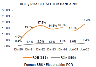 Indicadores de rentabilidad mejoran: A junio de 2025, la utilidad neta del ejercicio fue de S/ 7,072 MM, dando un incremento de +60.5% (+S/ 2,667 MM) interanual, derivado de menor gasto en provisiones y costes financieros de los pasivos. En consecuencia, los indicadores ROE y ROA anualizados alcanzaron un valor de 18.4% y 2.4%, respectivamente (jun-2024: 12.6% y 1.6%). Asimismo, los márgenes financiero, operativo y neto anualizados fueron de 58.5%, 32.5% y 22.2% (jun-2024: 44.6%, 22.4% y 14.9%), respectivamente. No obstante, sin incluir los nuevos bancos, los ingresos por cartera caerían -2.7%, y los ingresos financieros hubiesen crecido apenas +1.1%, lo cual se alinea a la cartera y la reducción de tasas.