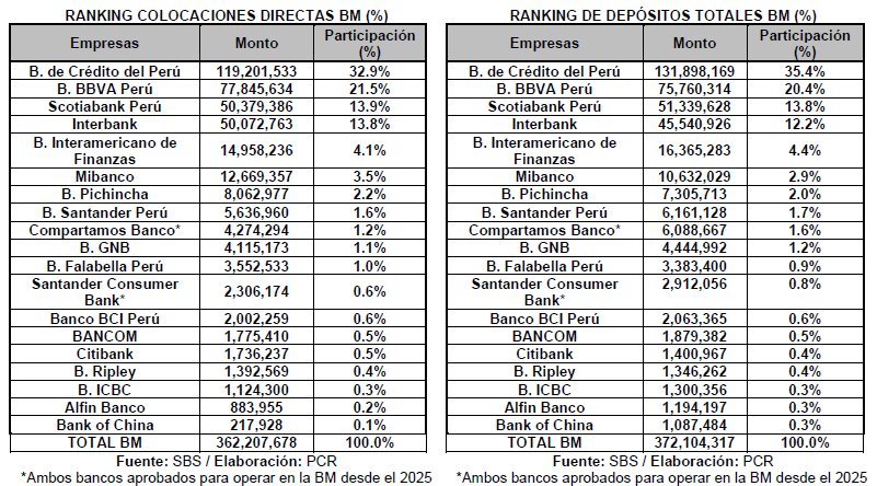 En detalle, respecto a las colocaciones, el BCP representa más del 30% del total de créditos otorgados por la Banca Múltiple, mientras que BBVA cuenta con un 21.5%, el Scotiabank con 13.9% e Interbank con 13.8%, siendo estos cuatro los considerados grandes bancos, dado que concentran poco más del 80% del total de créditos directos y depósitos en ese sector.