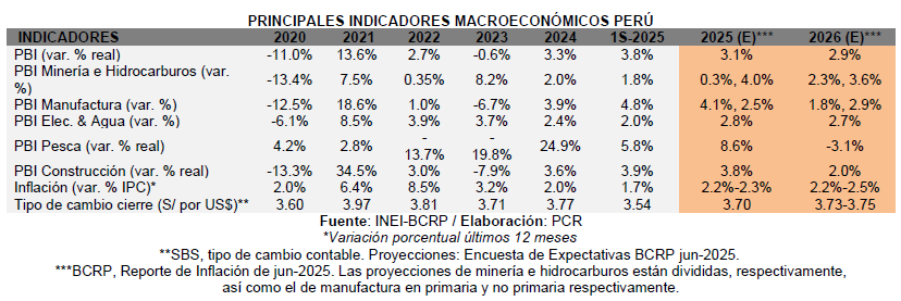El BCRP[1] proyecta que la economía tendrá una expansión de 3.1% en 2025, menor a lo estimado en el reporte de mar-2025 debido a un menor crecimiento esperado en los sectores de minería e hidrocarburos, ello alineado a condiciones climáticas más estables respecto al 2024 y una menor producción del hierro. Por el contrario, se prevé se estimule el gasto privado y, con ello, las actividades no primarias. Para el 2026, el producto crecería 2.9% considerando que las condiciones favorables se mantengan y un escenario de estabilidad política durante las elecciones generales de 2026.
