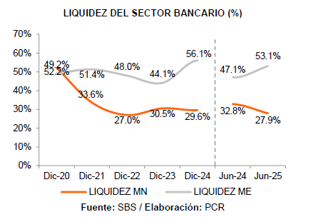 Adecuados indicadores de liquidez: A junio de 2025, la banca múltiple mantiene adecuados indicadores de liquidez en MN y ME, registrando 27.9% y 53.1%, respectivamente; manteniendo la liquidez producto de medidas aplicadas como la liberación de encajes, las operaciones de reporte de valores, moneda y cartera, y el endurecimiento en la originación, que presiona a invertir en activos líquidos como instrumentos de gobierno, que aún están rindiendo de manera atractiva, entre otros. Estos indicadores de liquidez son superiores a lo sugerido por el regulador. Asimismo, el Ratio de Cobertura de Liquidez está por encima de 160% en ambas monedas y en total, cumpliendo holgadamente la regulación local.
