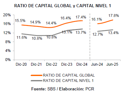 Importantes niveles de solvencia: A junio de 2025, el Ratio de Capital Global de la banca se ubicó en 17.8%, indicador superior al de jun-2024 (+170 pbs), dado el incremento del patrimonio efectivo de la banca, en línea con la mayor capitalización registrada y mejores resultados respecto al año previo; contrastado por el mayor requerimiento de capital principalmente de crédito, posiblemente también ambos derivados de la inclusión de nuevos bancos. Respecto al Capital Ordinario Nivel 1, este se ubicó en 13.4%, y similar el Tier 1, ubicándose por encima de lo requerido por el regulador, al igual que a nivel individual, siendo el indicador del patrimonio básico más bajo un 8.1% registrado por un banco pequeño enfocado en consumo.
