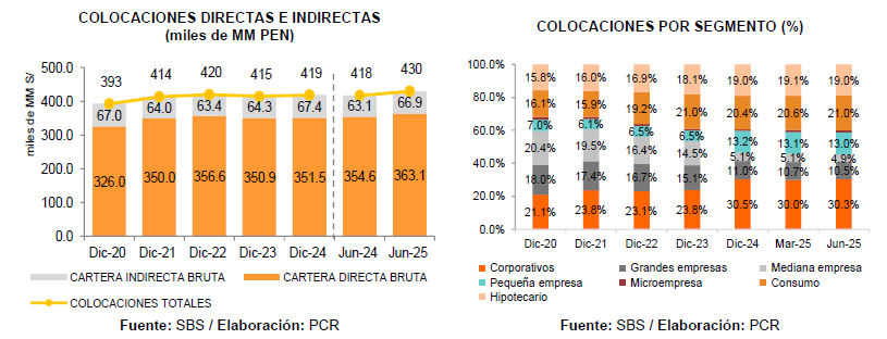 Crecimiento reducido de colocaciones: A junio de 2025, la cartera total bruta de la banca múltiple alcanzó los S/ 429,975 millones, con un crecimiento interanual de +2.9%, impulsado principalmente por créditos directos. En esa línea, el ritmo de colocaciones se mantiene moderado, con un avance semestral de +2.7%. Al aislar el efecto del ingreso de Compartamos Banco y Santander Consumer Bank a partir del presente año, los créditos directos habrían crecido apenas +0.5% interanual y un +1.4% respecto a diciembre, soportado principalmente por la resiliencia del retail (+3.6%), dado que a nivel empresarial habría una contracción (-1.4%). Los créditos indirectos avanzaron +6.0% interanual, y se reducen -0.8% vs dic-2024.