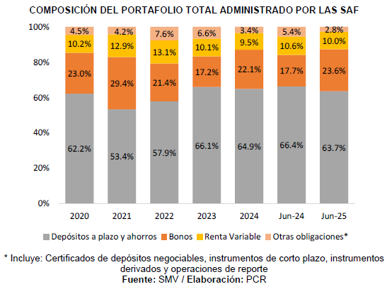 Diversificación del portafolio. El portafolio del sector de Fondos Mutuos se compone principalmente de depósitos, ya que representan un menor riesgo comparado con otros instrumentos. No obstante, se viene reduciendo su participación dado que las remuneraciones de los depósitos se van ajustando a la baja según la referencia tanto local como internacional. Por ello, a junio de 2025, la cartera de fondos mutuos se distribuyó de la siguiente manera: depósitos a plazo con el 63.7% (jun-2024: 66.4%), bonos con el 23.6% (jun-2024: 17.7%), renta variable con el 10.0% (jun-2024: 10.6%) y finalmente, la participación de Otras Obligaciones[1] ascendió a 2.8% (jun-2024: 5.4%).