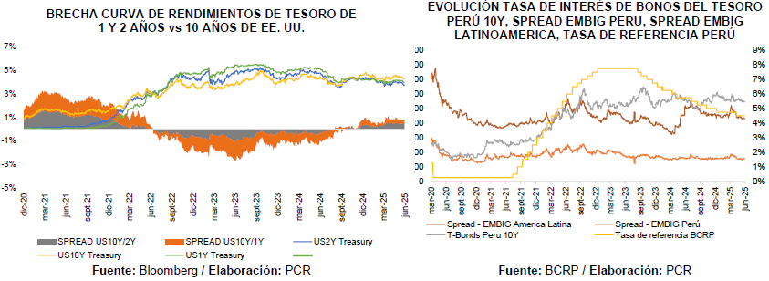 Por otro lado, a inicios de setiembre del 2024, el diferencial de rendimiento entre los Bonos del Tesoro Norteamericano a 10 y 2 años retornó a la normalidad registrándose positivo, luego una postura dovish por parte del banco central impactando en los rendimientos del bono de menor duración, algunos analistas mencionan que no necesariamente el riesgo de recesión sea inexistente, sino que la Fed al iniciar los recortes de tasas buscaría incentivar la actividad económica. El diferencial se mantuvo negativo desde 2022, en línea con el alza de tasas de la Fed para controlar la inflación, lo que generó expectativas de menor crecimiento, dado que una curva invertida suele anticipar una recesión. Al cierre de junio de 2025, el spread llegó a 51 pbs y a junio de 2024 en -36 pbs.