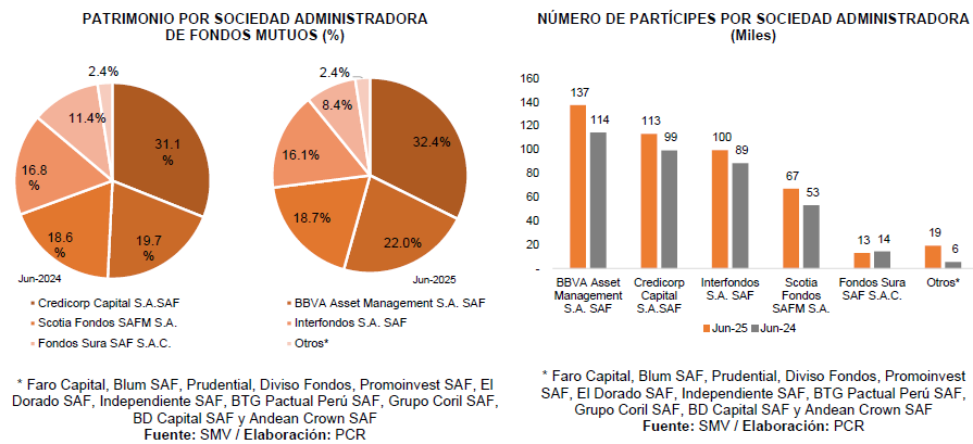 A junio de 2025, el mercado de Fondos Mutuos peruano estuvo conformado por 16 Sociedades Administradoras de Fondos (SAF). Se destaca que el sector presenta una concentración del patrimonio administrado en cinco SAF, las cuales pertenecen a grupos económicos internacionales: Credicorp Capital (32.4%), BBVA Asset Management (22.0%), Scotia Fondos (18.7%), Interfondos (16.1%) y Fondos Sura (8.4%), las cuales concentraron el 97.6% del total patrimonio administrado.