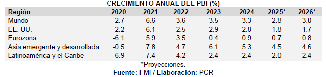 De acuerdo con la actualización del WEO (ene-2025) realizado por el FMI, la tasa de crecimiento del PBI mundial proyectada para el cierre del 2025 y 2026 es de 3.3%, ubicándose por debajo del promedio anual durante el 2000-2019 de 3.7%, en el caso del 2025 esta es igual que las perspectivas del anterior informe. Principalmente, Se espera que el crecimiento en Estados Unidos se desacelere respecto a la proyección de enero de 2025, debido a mayor incertidumbre política, tensiones comerciales y un impulso más débil de la demanda, mientras que en la zona del euro también se anticipa una moderación del crecimiento. En las economías de mercados emergentes y en desarrollo, se prevé una desaceleración, con rebajas más significativas en los países más afectados por recientes medidas comerciales, como China.