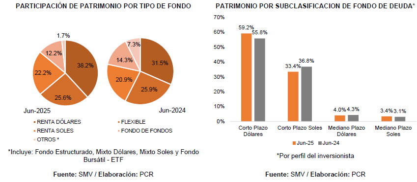 El organismo regulador de Fondos Mutuos, la SMV, mediante el Reglamento de Fondos Mutuos, ha clasificado los fondos según su política de inversiones. A junio del 2025, la mayor participación del patrimonio administrado por el sector permaneció en los Fondos de Instrumentos de Deuda[3] con un 60.4%, seguido de los Fondos Flexibles con el 25.6% y los Fondos de Fondos representaron el 12.2%. El 1.7% restante, se concentra en Fondos Estructurados (0.6%), Fondo Bursátil – ETF (0.7%), Fondos de Renta Variable (0.3%) y Fondos de Renta Mixta[4] (0.3%).