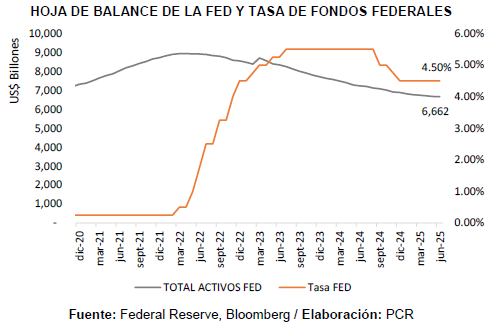 Respecto a las políticas monetarias implementadas, luego de la época de incremento de tasas de referencia iniciado en el 2022 hasta mediados del 2023, habiendo controlado la inflación, iniciaron los recortes. A detalle, se tiene que la tasa de referencia estadounidense pasó de 0.25% en prepandemia a 5.50% en julio del 2023 y se mantuvo hasta mediados de setiembre del 2024, cuando la Fed realizó el primer recorte de 50 pbs, ubicándola en rango de 4.75% – 5.00%. Posterior, se realizaron dos cortes de 25 pbs cada uno en noviembre y diciembre del 2024, siendo a la fecha 4.25%-4.50%. En setiembre de 2025, a Fed redujo la tasa de interés en 25 pbs, situándola entre 4.00% y 4.25%, debido a un mercado laboral más débil.