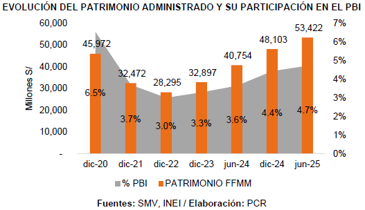 Durante el primer semestre del 2025, el sistema de Fondos Mutuos mostró una tendencia positiva de crecimiento, efecto asociado principalmente a los mejores retornos locales. Por ello, a junio del 2025, el Patrimonio Administrado fue de S/ 53,422 MM (USD 15,095 MM), representando un aumento de 31.1% (+ S/ 12,668 MM) con respecto a jun-2024. El monto del patrimonio total representó una participación del 4.7% del PBI, por encima a lo registrado en el mismo periodo del año anterior (jun-2024: 3.6%) tras las mayores inversiones de los partícipes.