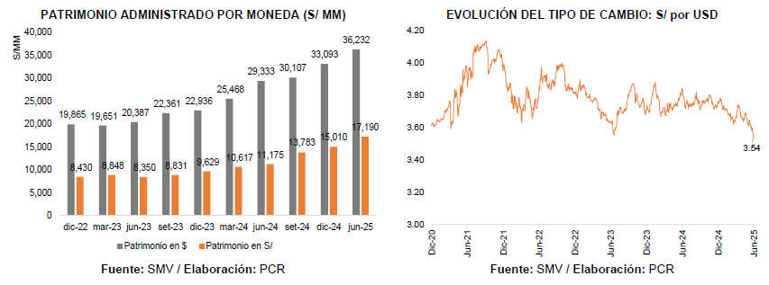 A junio de 2025, el total del valor de la cartera administrada por las SAF asciende a S/ 53,422 MM, se compone por fondos con valor cuota en dólares por S/ 36,232 MM (67.8%), mientras que el restante S/ 17,190 MM (32.2%) pertenece a valor cuota en soles.