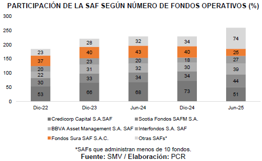 Evolución del número de Fondos Mutuos A junio de 2025, el sistema de fondos mutuos peruano estuvo conformado por 260 fondos operativos (jun-2024: 229). De ello, las 5 primeras SAFs administran 186 fondos. A detalle, Credicorp Capital administra 51 fondos, seguido por Interfondos con 44 fondos, Fondos Sura con 39 fondos, BBVA Fondos con 27 fondos, Scotiabank con 25 fondos. Finalmente, los 74 fondos restante se encuentra dividido principalmente en Blum SAF con 19 fondos, Faro Capital SAF con 15 fondos, El Dorado SAF con 12 fondos, Prudential SAF con 9 fondos, Andean Crown SAF con 6 fondos, Independiente SAF con 5 fondos, BTG Pactual SAF con 3 fondos, Diviso fondos con 2 fondos, Promoinvest, BD Capital SAF y Grupo Coril SAF con 1 fondo cada uno.