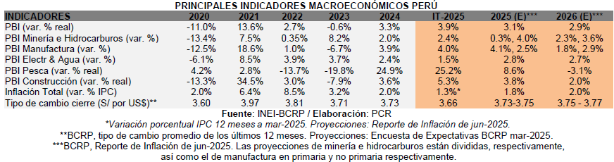 El BCRP[1] proyecta que la economía tendrá una expansión de 3.1% en 2025, menor a lo estimado en el reporte de mar-2025 debido a un menor crecimiento esperado en los sectores de minería e hidrocarburos, ello alineado a condiciones climáticas más estables respecto al 2024 y una menor producción del hierro. Por el contrario, se prevé se estimule el gasto privado y, con ello, las actividades no primarias. Para el 2026, el producto crecería 2.9% considerando que las condiciones favorables se mantengan y un escenario de estabilidad política durante las elecciones generales de 2026.